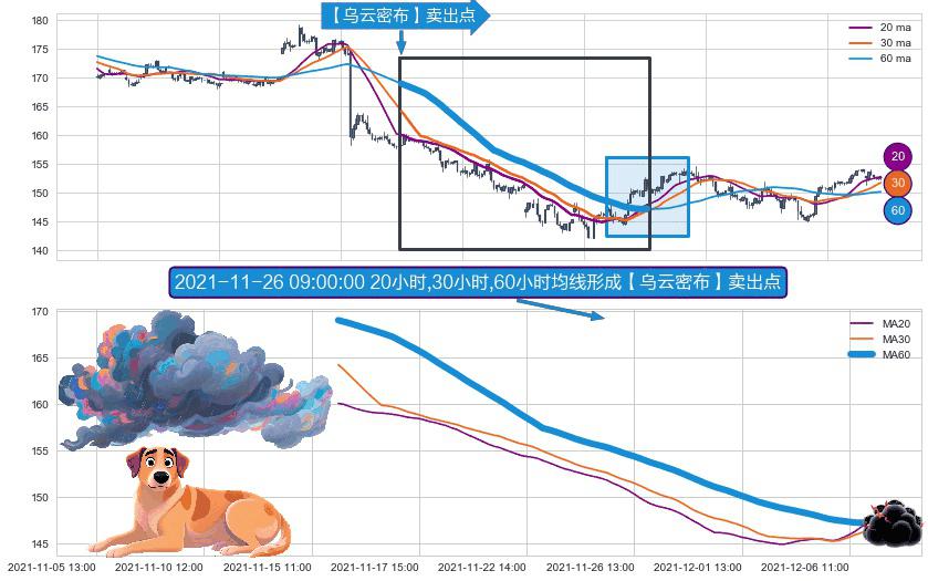 ⚀ 2021-11-15 16:00:00小时-2021-12-07 10:00:00小时显现 20小时-30小时-60小时均线 【乌云密布】卖出点 看空信号,后市看跌,卖出