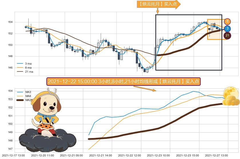 ⚀ 2021-12-21 10:00:00小时-2021-12-27 13:00:00小时显现 3小时-8小时-21小时均线 【烘云托月】买入点 看多信号,后市看涨,买入