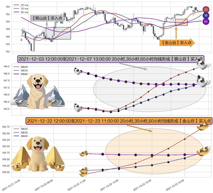 ⚀ 2021-12-22 13:00:00-小时至2021-12-23 11:00:00-小时显现 20小时-30小时-60小时均线 【金山谷】买入点 其再次确认了买入信号,可靠性更强,买入