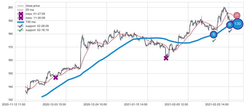 ⚀ 买点向上突破均线后,价格走势很纠结,不断在均线周围试探,有再次下探破位均线的可能