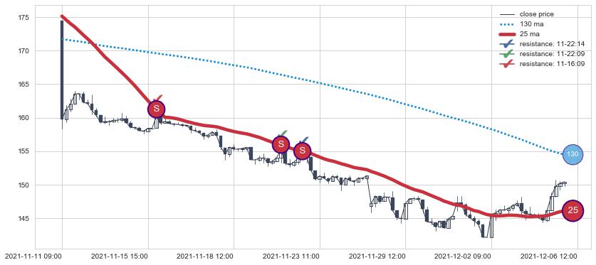 ⚄ 价格在均线遇到阻力后再次向下回落了【极短】距离, 第⑦卖出点 阻力效果【等待验证】