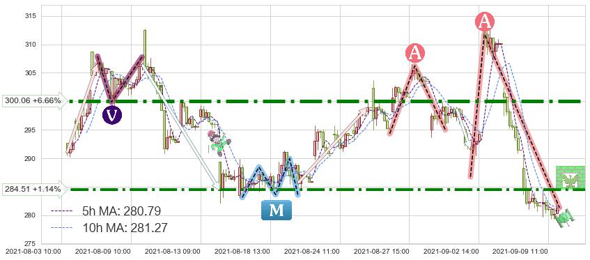➣ 【已达成】最小【整理】第一目标价格→(09-09:12: 280.04 ), 后续继续【整理】下跌动力依然存在,下跌空间适中