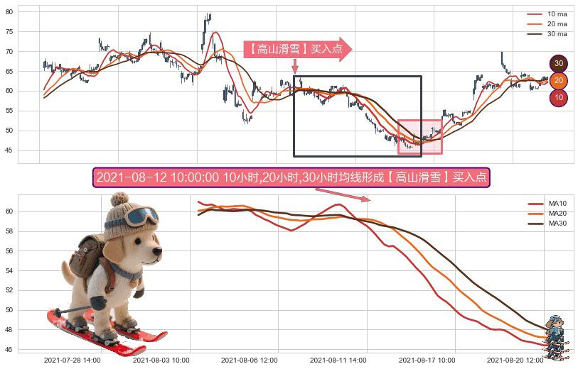形态多维评估: ⚀ 2021-08-03 12:00:00小时-2021-08-20 13:00:00小时显现 10小时-20小时-30小时均线 【高山滑雪】买入点 看多信号,后市看涨,买入