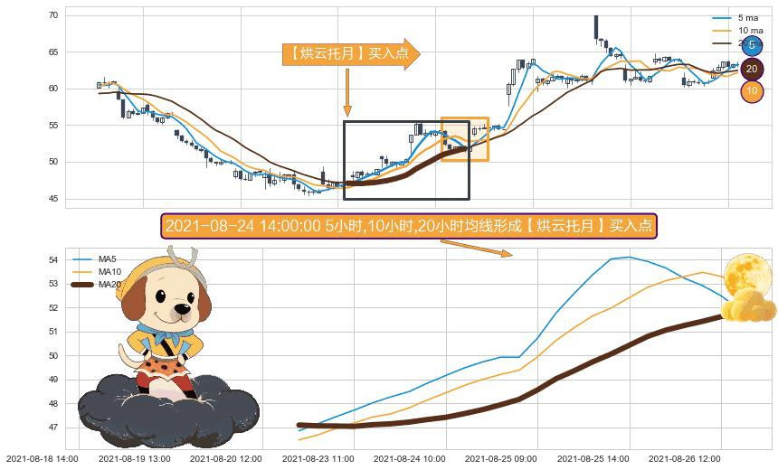 形态多维评估: ⚀ 2021-08-20 14:00:00小时-2021-08-26 13:00:00小时显现 5小时-10小时-20小时均线 【烘云托月】买入点 看多信号,后市看涨,买入