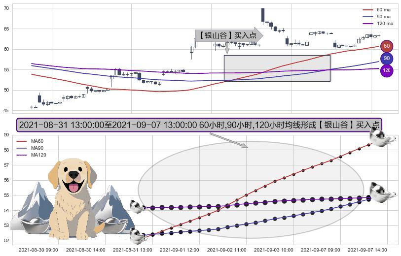 形态多维评估: ⚀ 2021-08-31 14:00:00-小时至2021-09-07 13:00:00-小时显现 60小时-90小时-120小时均线 【银山谷】买入点 看多信号,后市看涨,买入