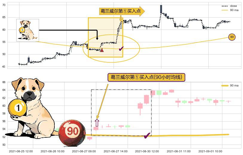 形态多维评估: ⚀ 2021-08-27 09:00:00-小时显现 葛兰威尔均线 90小时均线 第买①入点 走势反转见底信号,后市看涨,买进信号