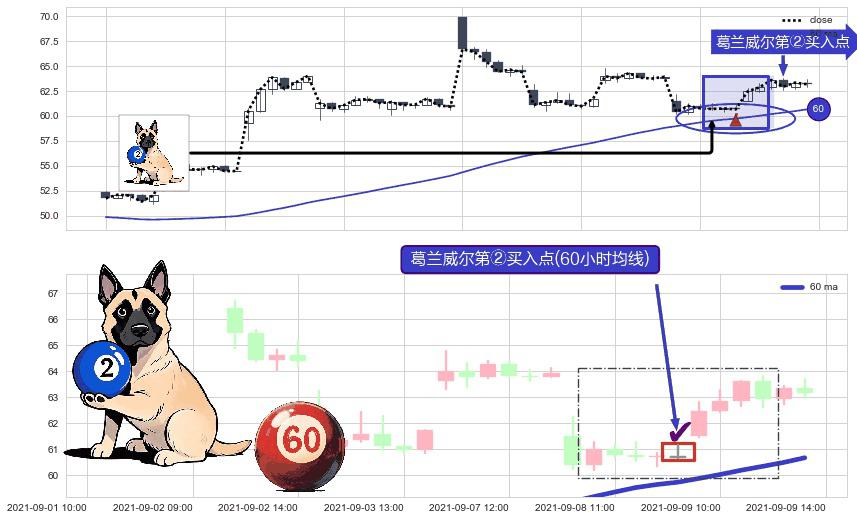 形态多维评估: ⚀ 2021-09-08 14:00:00-小时显现 葛兰威尔均线 60小时均线 第②买入点 上升趋势的中继信号,后市看涨,买进信号