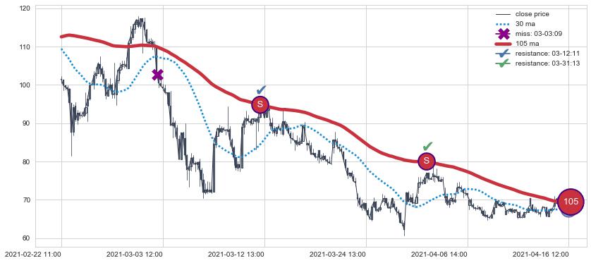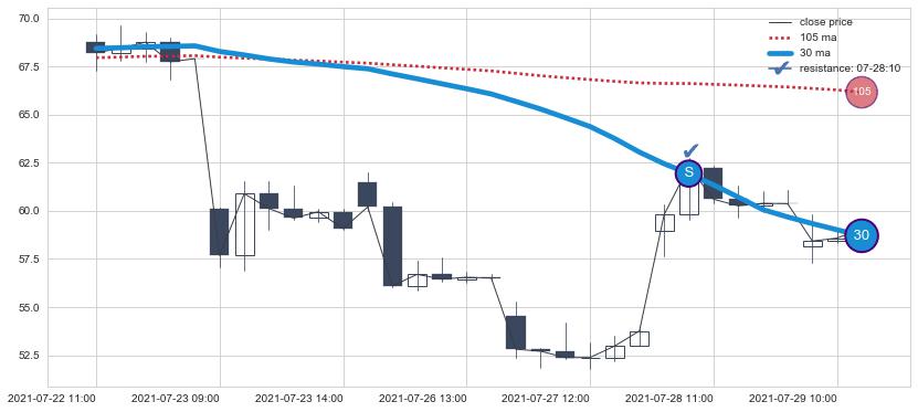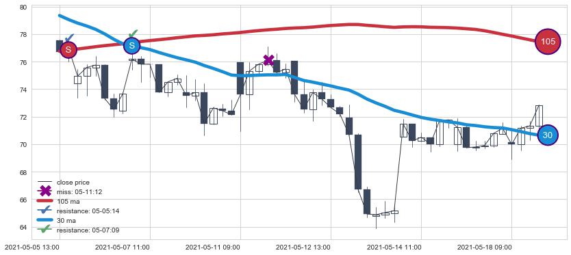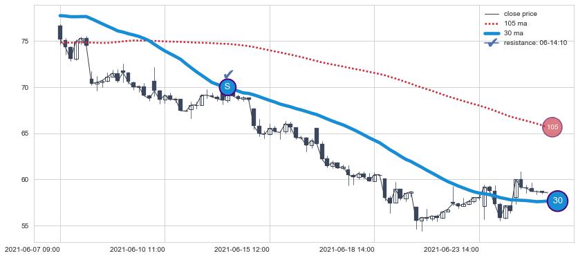 下跌趋势05-03 14:00-05-18 12:00,均线105, 30确认关键阻力2处