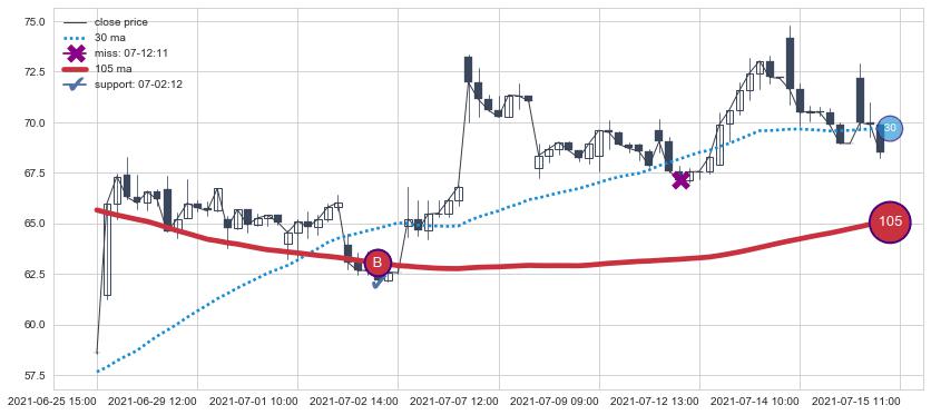 上涨趋势06-25 15:00-07-15 11:00,均线105确认关键支撑1处