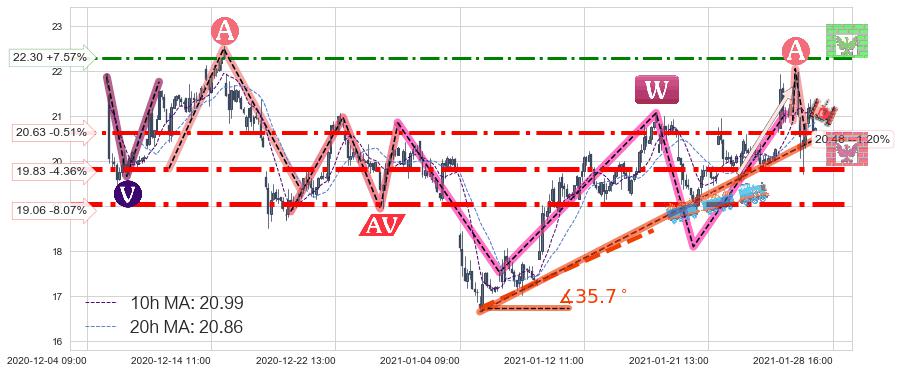 ♘ 支撑价格位19.83,可信任强度85.28%,距离最后交易2021-01-28 16:00形成的收盘价格20.73相差 -4.36%