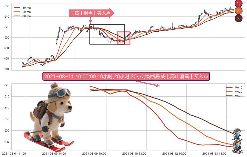 ⚀ 2021-08-06 13:00:00小时-2021-08-13 15:00:00小时显现 10小时-20小时-30小时均线 【高山滑雪】买入点 看多信号,后市看涨,买入