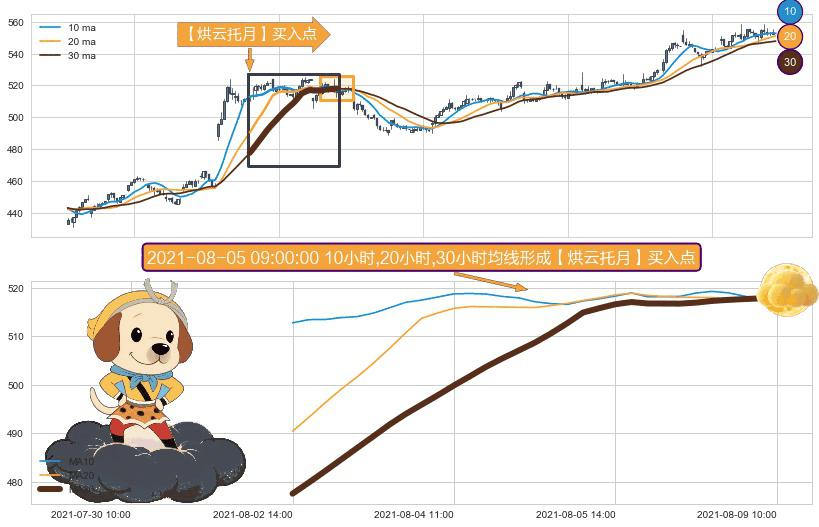 ⚀ 2021-08-02 14:00:00小时-2021-08-09 10:00:00小时显现 10小时-20小时-30小时均线 【烘云托月】买入点 看多信号,后市看涨,买入