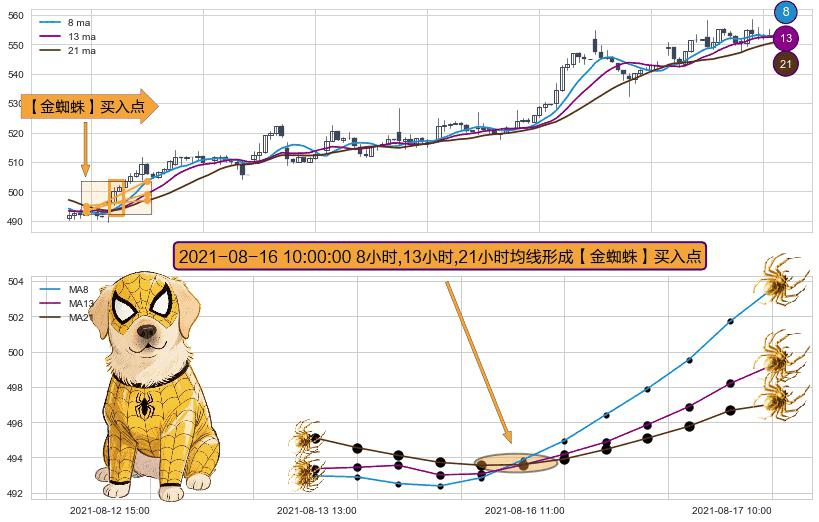 ⚀ 2021-08-16 10:00:00小时显现 8小时-13小时-21小时均线 【金蜘蛛】买入点 看多信号,后市看涨,买入