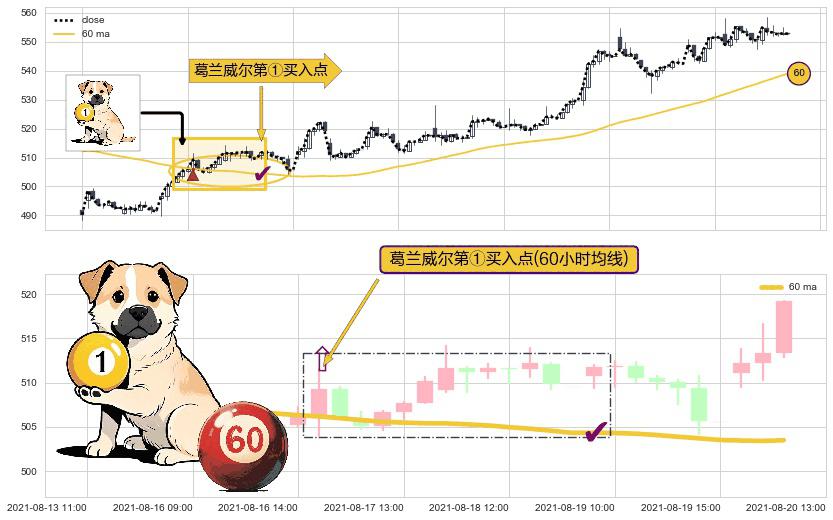 ⚀ 2021-08-17 09:00:00-小时显现 葛兰威尔均线 60小时均线 第买①入点 走势反转见底信号,后市看涨,买进信号
