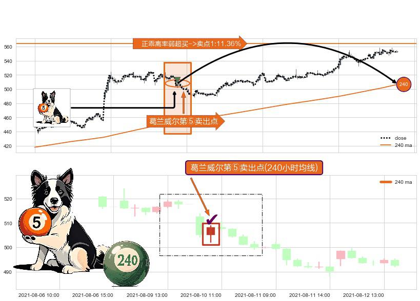⚀ 2021-08-10 10:00:00-小时显现 葛兰威尔均线 240小时均线 第⑤卖出点 上升趋势均值回复的短线回落信号,后市看跌,卖出信号