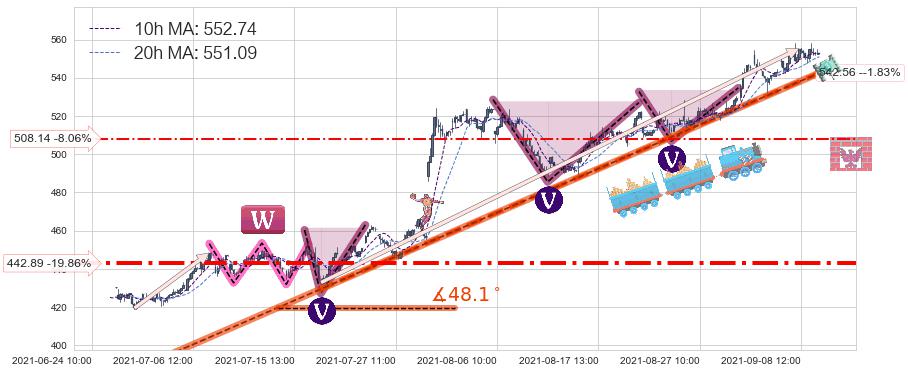 ♘ 在最后的上升阶段2021-06-29 10:00至2021-09-09 14:00存在 持续未破位的支撑位 ,支撑价格542.56,支撑可信任强度87.36%,其距离最后价格552.66相差 -1.83%