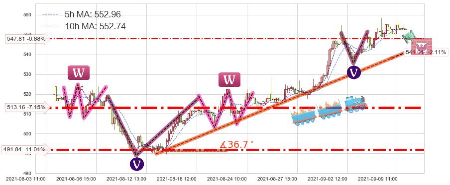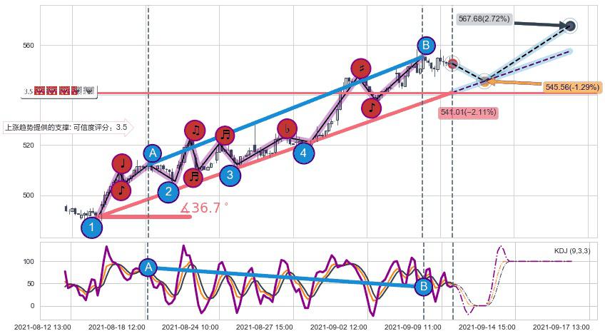 ➢ 预测:2021-09-13 12:00,【小幅回撤】稳定目前上涨趋势的前提下,预测价格:545.56