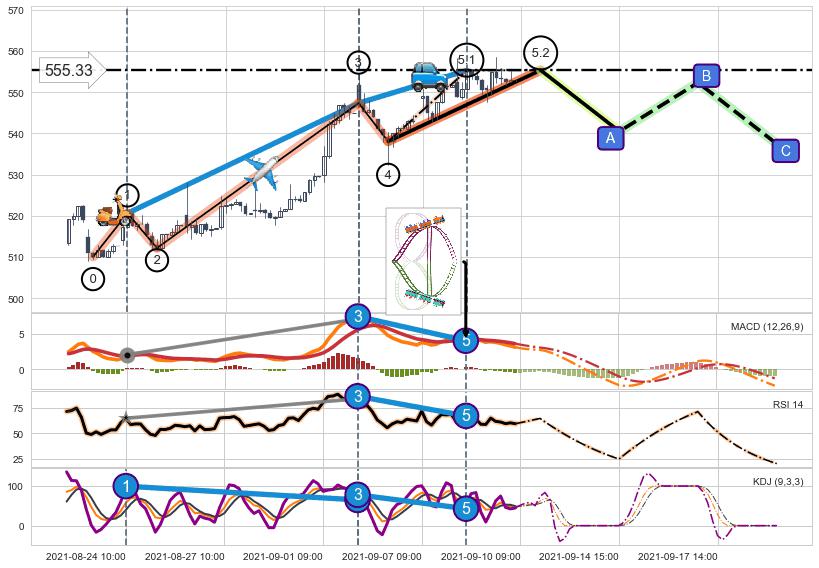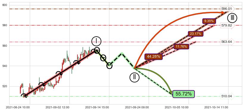 ➣ 5.1: 预测当前第5浪位置(09-08:11, 555.28),仍然有上升空间