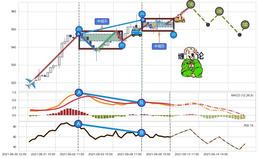 ➣ 【未完成】缠论 起点:08-30:13, 完成第1中枢A,完成第2中枢B,到达09-09:15
