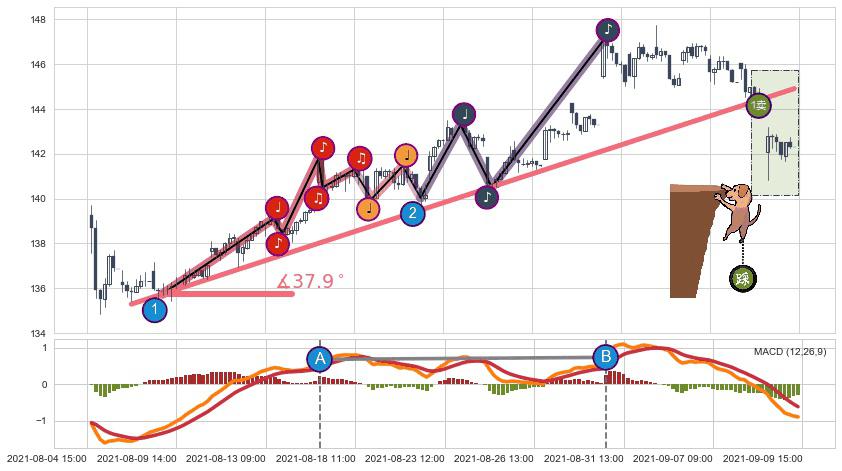 ➣ 2021-08-06 11:00-2021-08-31 14:00上升趋势存在反转[风险],其原上升趋势的支撑位(144.91)已破位[强阻力信号],原上升趋势角度: 37.9˚