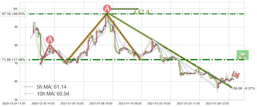 从2021-01-08 11:00至2021-01-28 13:00,共包含107个小时,阶段股价下跌-43.65%,阶段股价变动位移路程比: 1 : 4,下跌趋势角度: 42.4