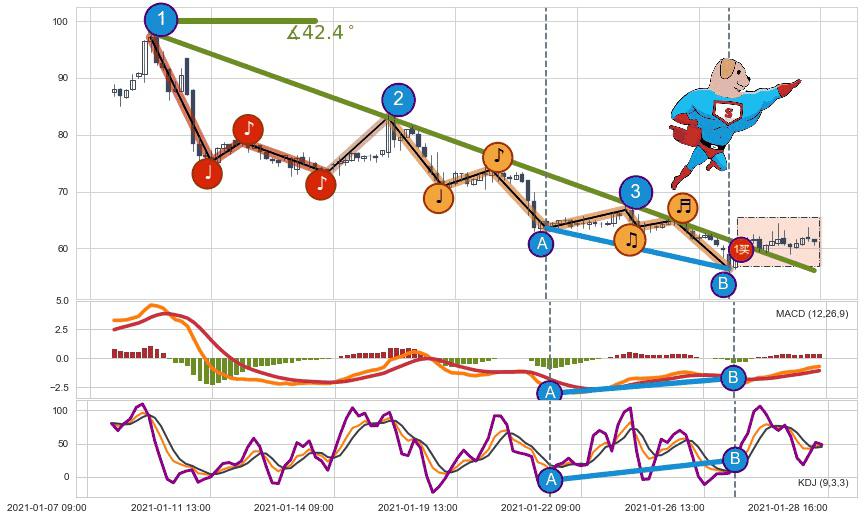 从2021-01-15 10:00至2021-01-28 13:00,共包含68个小时,阶段股价下跌-29.44%,阶段股价变动位移路程比: 1 : 3,下跌趋势角度: 41.7