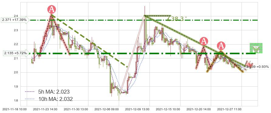 ♘ 在最后的下跌阶段2021-12-09 09:00至2021-12-27 14:00,存在 持续未破位的阻力位 ,阻力价格2.039,可信任强度69.73%,其距离最后价格2.020相差 +0.93%