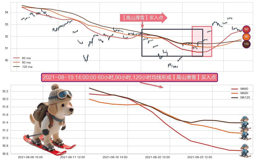 形态多维评估: ⚀ 2021-08-11 14:00:00小时-2021-08-27 14:00:00小时显现 60小时-90小时-120小时均线 【高山滑雪】买入点 看多信号,后市看涨,买入