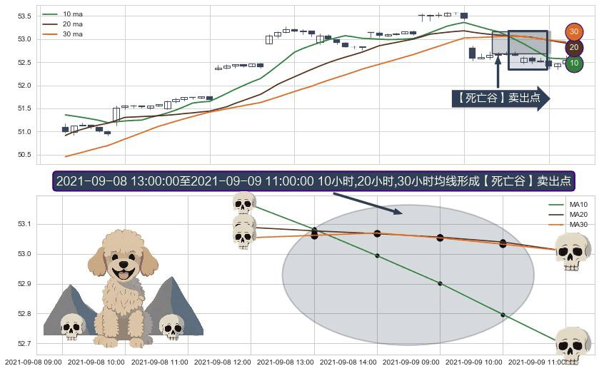 形态多维评估: ⚀ 2021-09-08 14:00:00-小时至2021-09-09 11:00:00-小时显现 10小时-20小时-30小时均线 【死亡谷】卖出点 看空信号,后市看跌,卖出