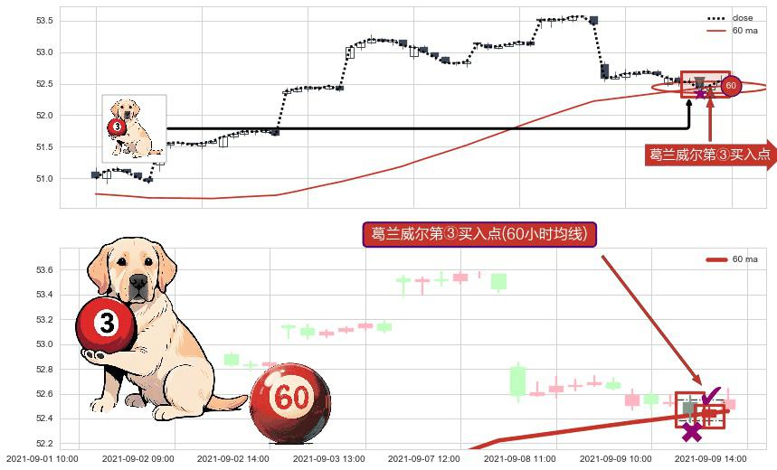 形态多维评估: ⚀ 2021-09-09 13:00:00-小时显现 葛兰威尔均线 60小时均线 第③买入点 上升趋势的中继信号,后市看涨,买进信号