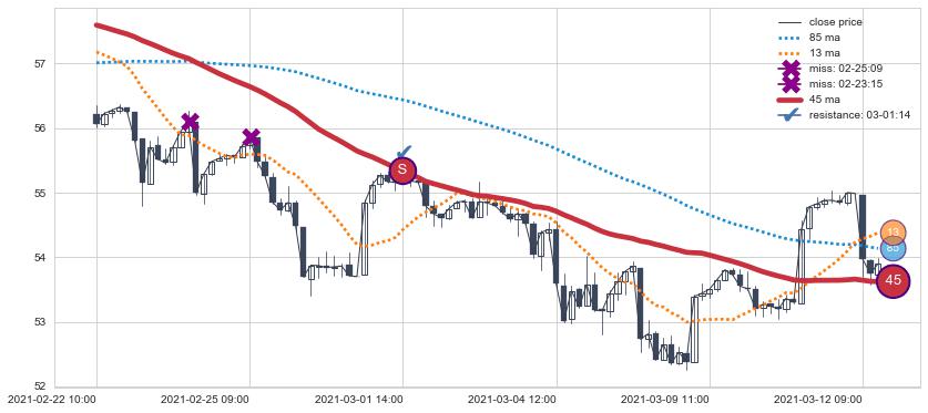 下跌趋势02-22 10:00-03-12 11:00,均线45确认关键阻力1处