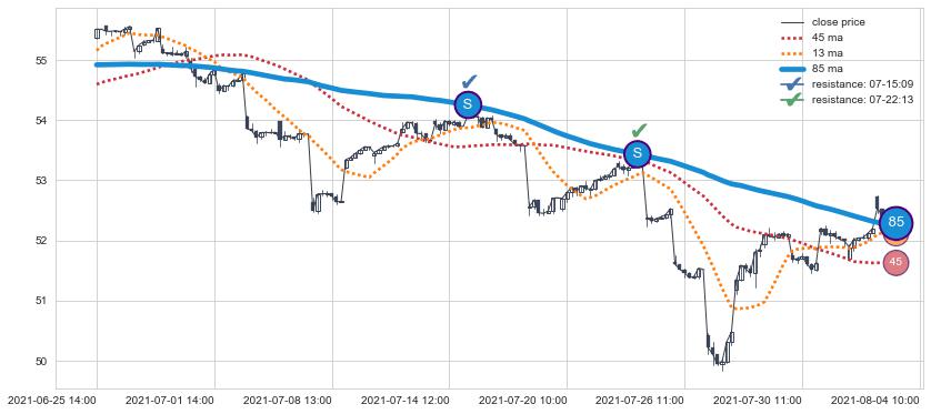 下跌趋势06-25 14:00-08-04 10:00,均线85确认关键阻力2处