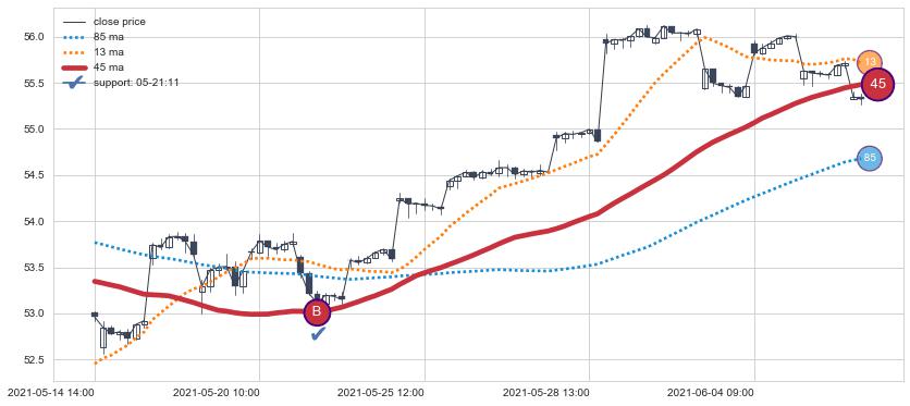 上涨趋势05-14 14:00-06-08 10:00,均线45确认关键支撑1处