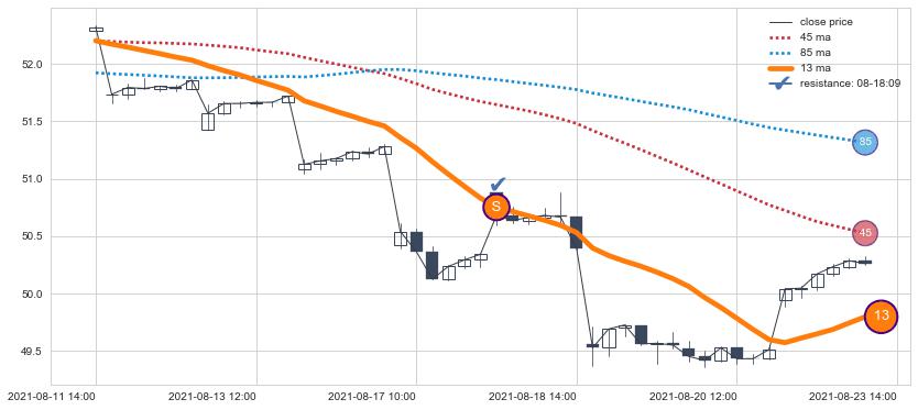 下跌趋势08-11 14:00-08-23 14:00,均线13确认关键阻力1处