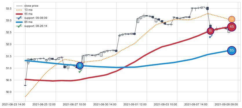 上涨趋势08-23 14:00-09-09 09:00,均线85, 45确认关键支撑2处