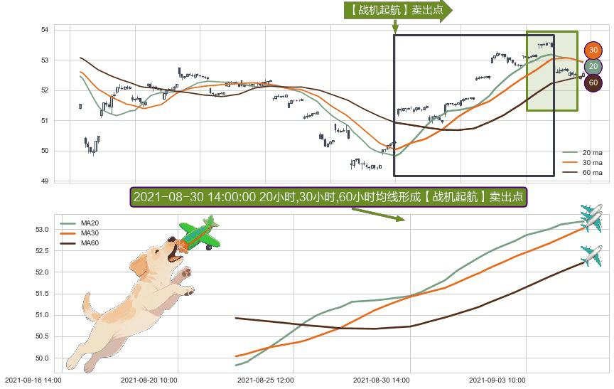 形态多维评估: ⚀ 2021-08-23 14:00:00小时-2021-09-07 14:00:00小时显现 20小时-30小时-60小时均线 【战机起航】卖出点 看空信号,后市看跌,卖出