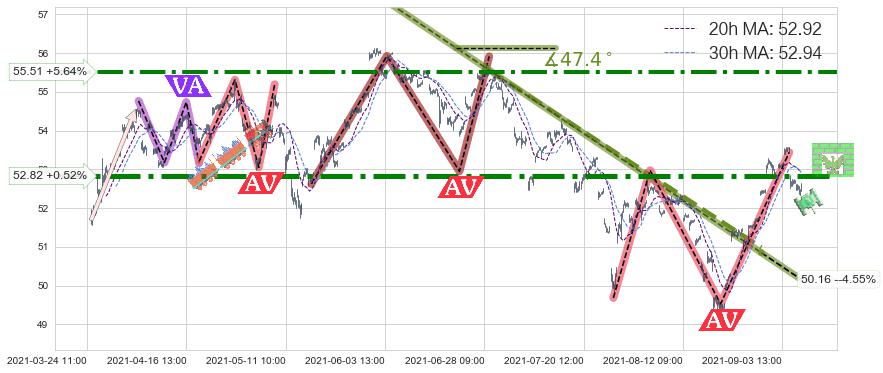 ♘ 阻力价格位52.82,可信任强度92.91%,距离最后交易2021-09-09 14:00形成的收盘价格52.55相差 +0.52%