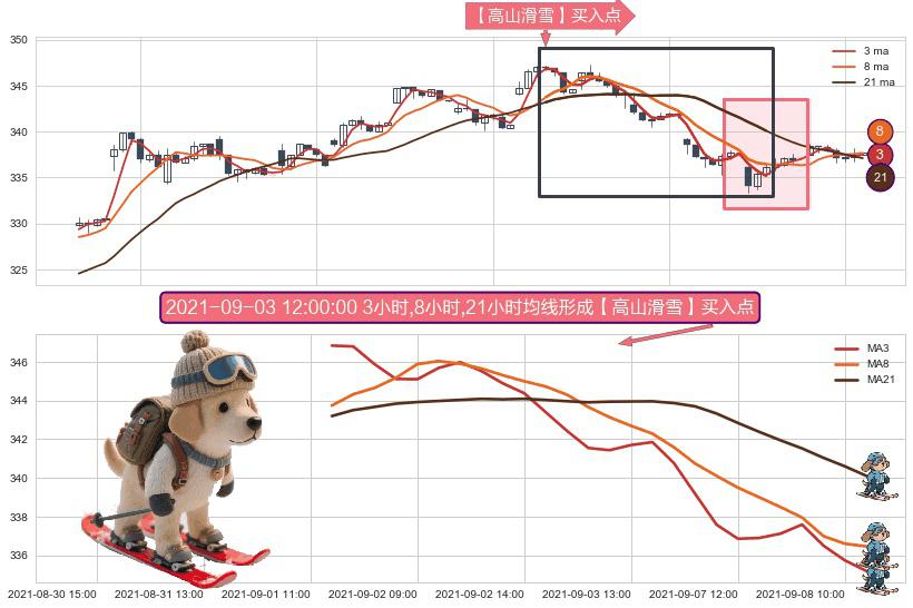 ⚀ 2021-09-01 12:00:00小时-2021-09-08 11:00:00小时显现 3小时-8小时-21小时均线 【高山滑雪】买入点 看多信号,后市看涨,买入