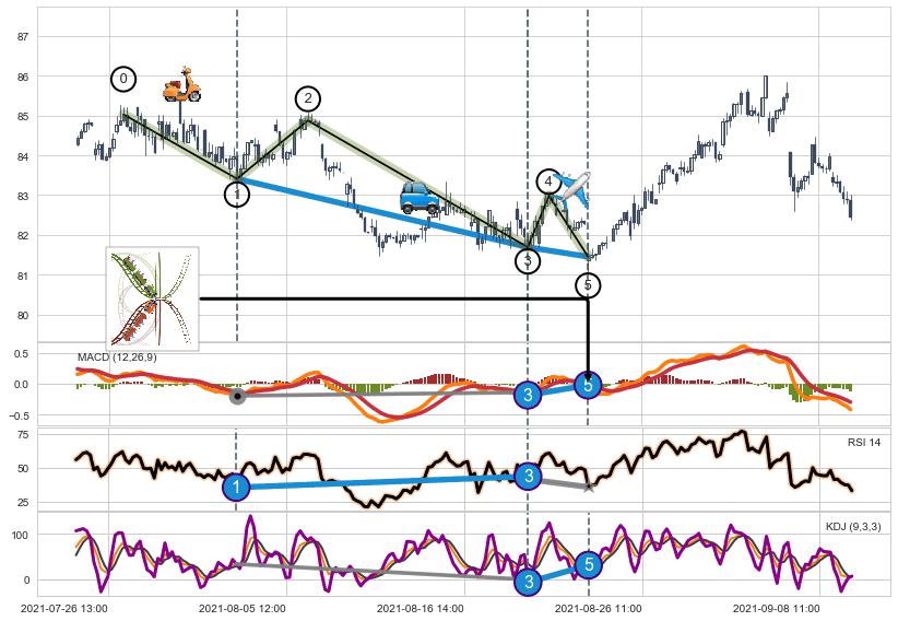 ➣ 1,3,5驱动浪MACD, RSI, KDJ走势都出现【常规背离】反转信号增强