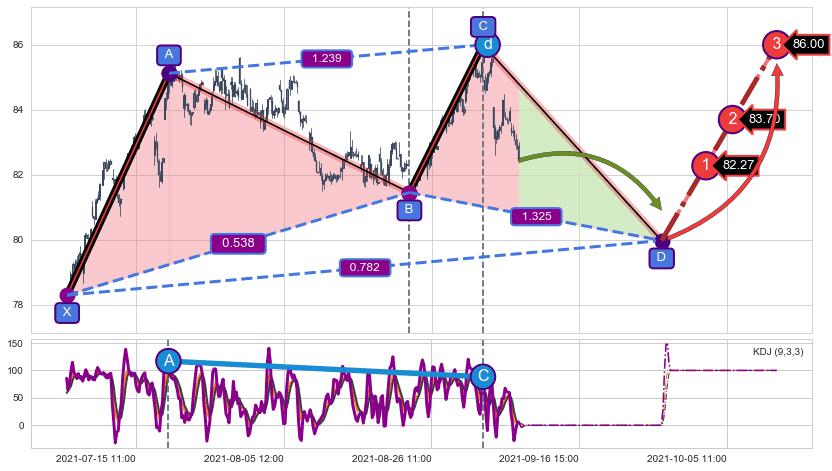 ➢ 谐波价格A点比C点低 ⤵,【KDJ】指标A点比C点高 ⤴️