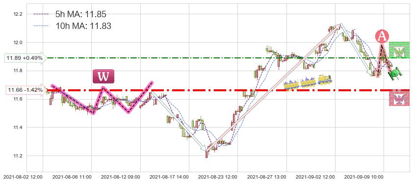 ♘ 阻力价格位11.89,可信任强度46.70%,距离最后交易2021-09-09 14:00形成的收盘价格11.83相差 +0.49%