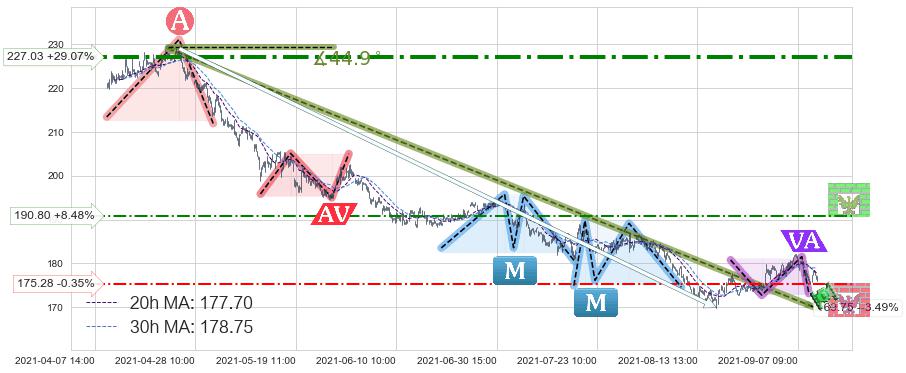 ♘ 阻力价格位190.80,可信任强度53.00%,距离最后交易2021-09-09 14:00形成的收盘价格175.89相差 +8.48%