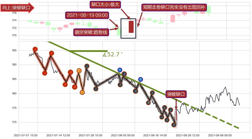 从2021-07-01 10:00至2021-08-19 10:00,共包含221个小时,阶段股价下跌-10.70%,阶段股价变动位移路程比: 1 : 7,下跌趋势角度: 52.7