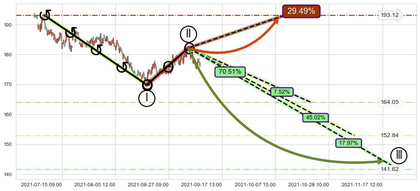 ➢ 循环浪继续向下【最低】位置(11-23:14, 141.62),匹配聚类样本比例25.49%, 可能性概率17.97%
