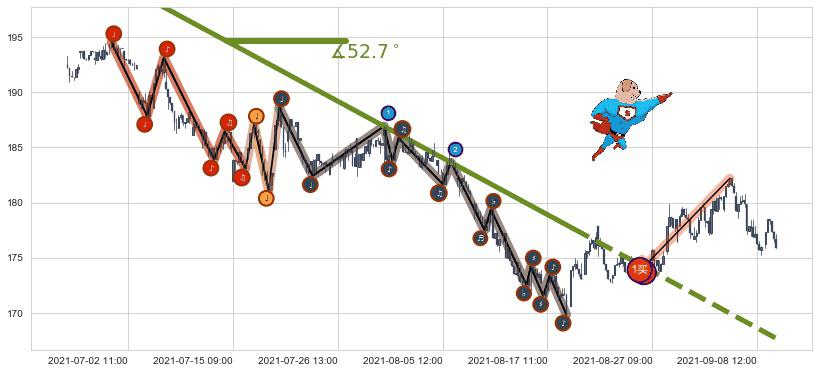 ➣ 2021-07-01 10:00-2021-08-19 10:00下跌趋势存在反转上涨[机会],其原下跌趋势的阻力位(167.72)已被突破[强支撑信号],原下跌趋势角度: 52.7˚