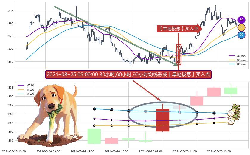 形态多维评估: ⚀ 2021-08-25 09:00:00小时显现 30小时-60小时-90小时均线 【旱地拔葱】买入点 看多信号,后市看涨,买入