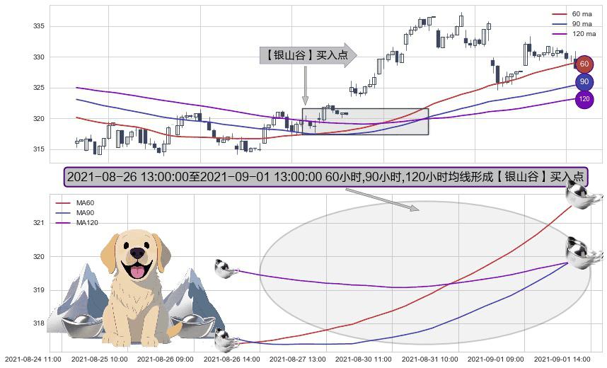 形态多维评估: ⚀ 2021-08-26 14:00:00-小时至2021-09-01 13:00:00-小时显现 60小时-90小时-120小时均线 【银山谷】买入点 看多信号,后市看涨,买入