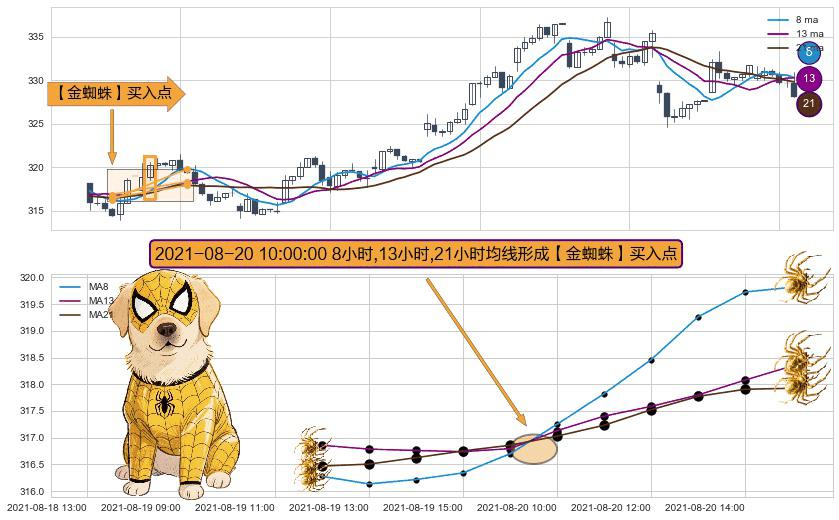 形态多维评估: ⚀ 2021-08-20 10:00:00小时显现 8小时-13小时-21小时均线 【金蜘蛛】买入点 看多信号,后市看涨,买入