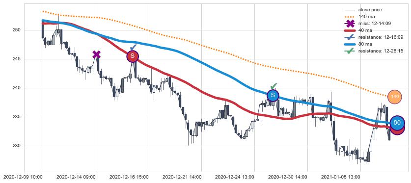 下跌趋势12-09 10:00-01-07 10:00,均线40, 80确认关键阻力2处