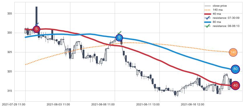下跌趋势07-29 11:00-08-18 10:00,均线40, 80确认关键阻力2处